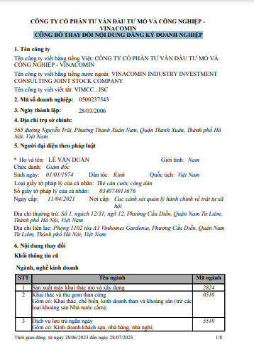 Công ty cổ phần Tư vấn đầu tư mỏ và công nghiệp -Vinacomin xin công bố thay đổi nội dung đăng ký doanh nghiệp - Giấy Chứng nhận đăng ký kinh doanh lần thứ 16 của Công ty như sau: